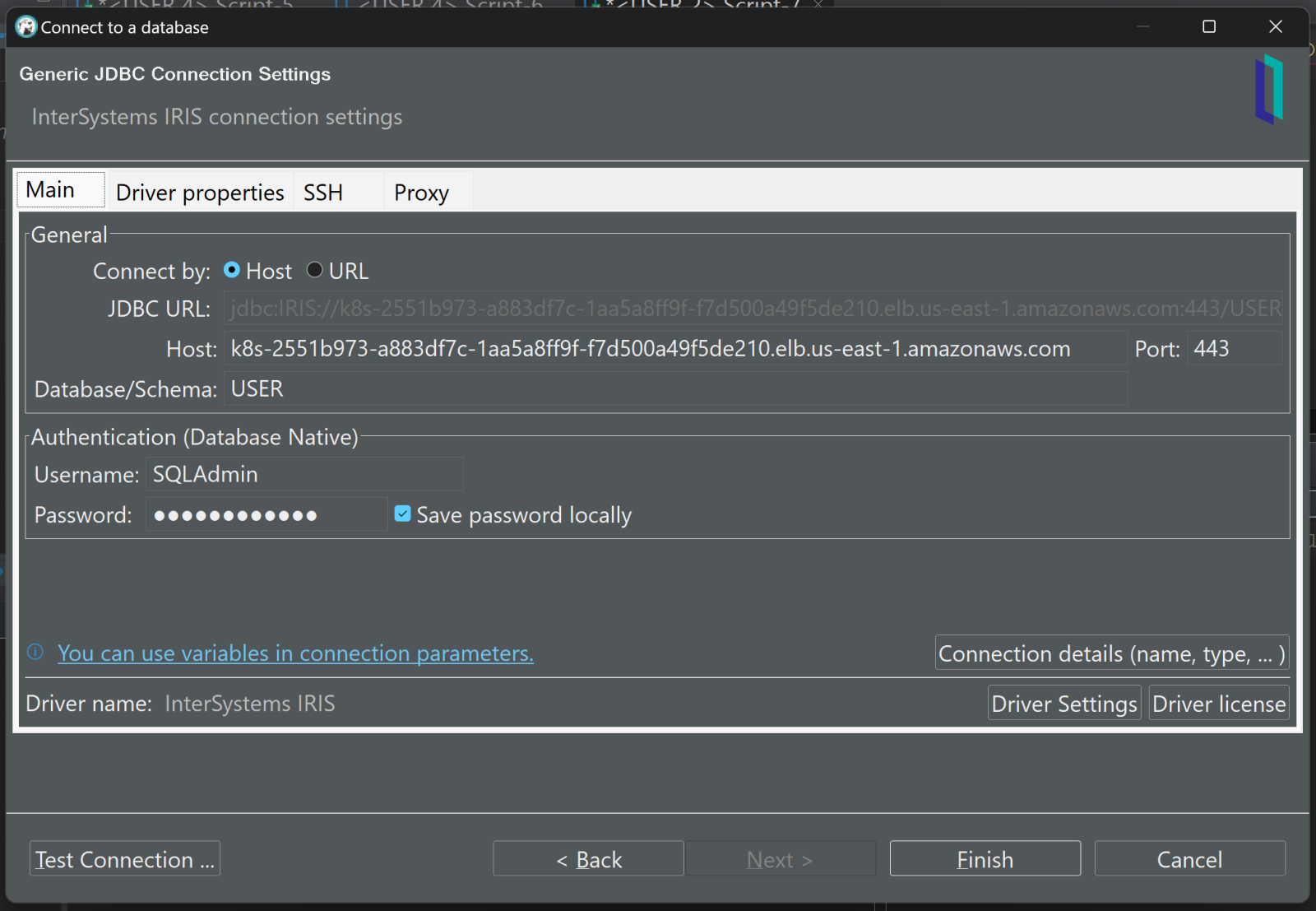 Maintenant que nous avons installé notre certificat et spécifié où IRIS JDBC peut le trouver, nous pouvons créer notre connexion DBeaver. Tous les paramètres de l'onglet « principal » de la boîte de dialogue de création de connexion se trouvent dans l'écran des détails du déploiement comme collé ci-dessus :