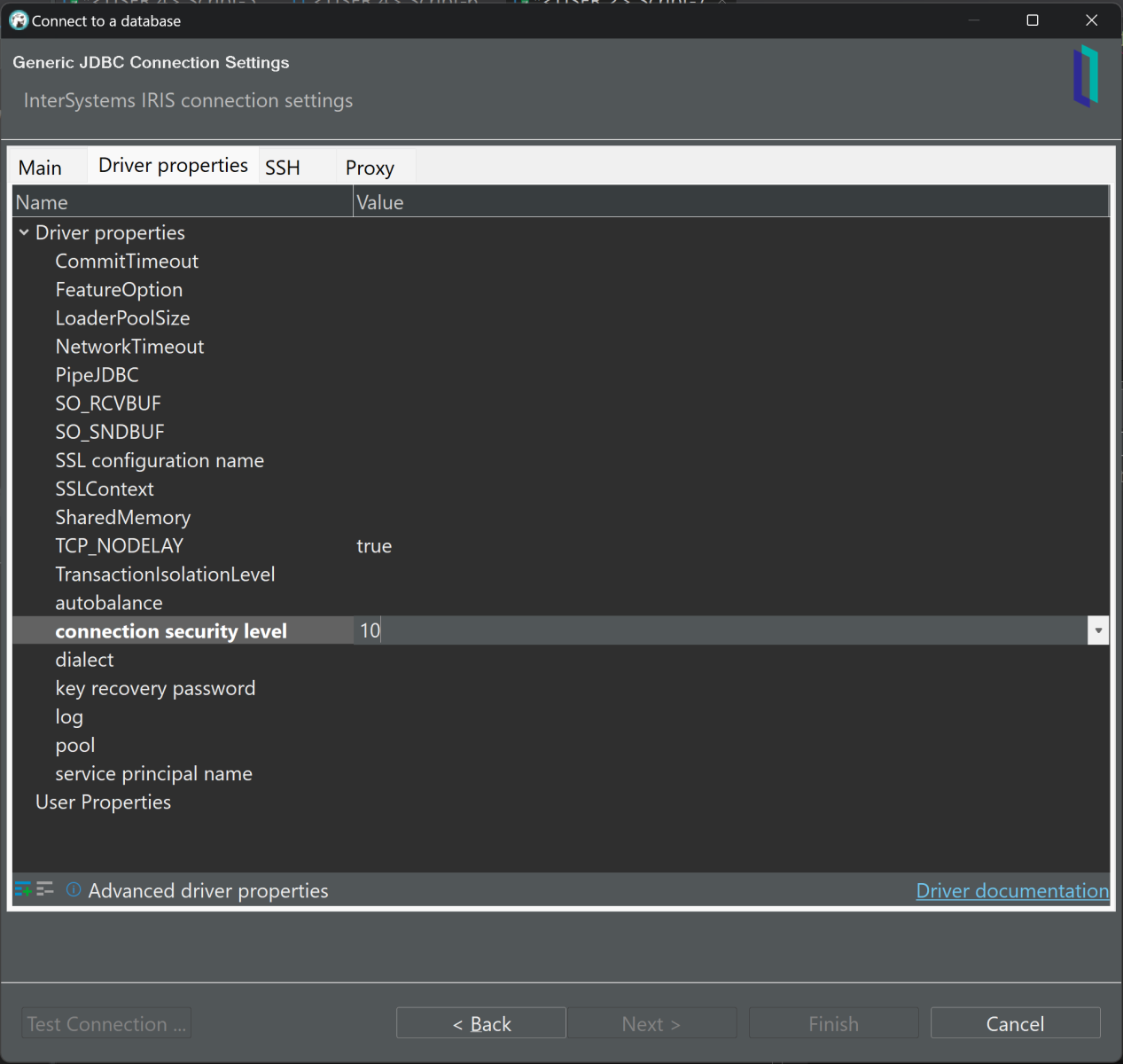 La seule chose qui reste à faire est de dire à DBeaver d'activer le cryptage, ce qui se fait en définissant le « niveau de sécurité de connexion » sur 10 dans l'onglet « Propriétés du pilote » :