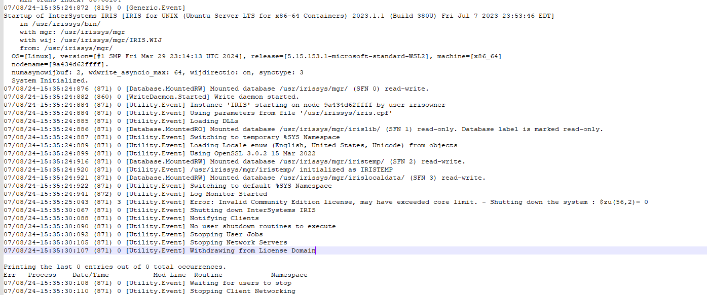 ✔ Container my-iris Created 0.2s À l'étape 6/6, le fichier iris.script est exécuté dans l'instance IRIS conteneurisée et les journaux sont enregistrés dans le chemin /opt/irisapp/logs/build.log.